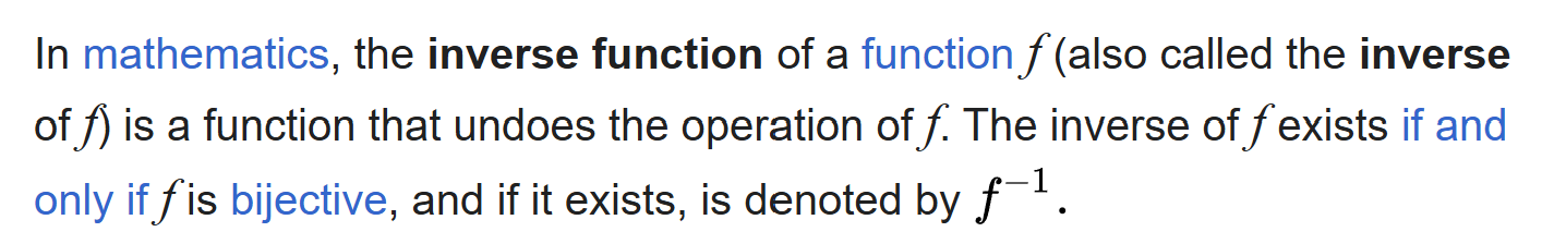 From the preceding item, to understand the inverse of a function \(f\) we must understand what it means for a function \(f\) to be bijective. Again, Wikipedia is helpful, Bijection. Please read carefully the definition below.