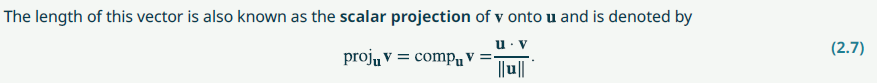 This is quite confusing. When you look at (2.7), on the left-hand side is a vector, while on the right-hand side is a scalar. They cannot be equal. Vector can never equal a scalar. I was not familiar with the concept scalar projection of \(\mathbf{v}\) onto \(\mathbf{u}.\) Based on my research, the common meaning of the scalar projection of \(\mathbf{v}\) onto \(\mathbf{u}\) is not the length of the projection, but something a little more complicated. One could say that it is the signed length; it is the length when the projection and \(\mathbf{u}\) point in the same direction and it is the opposite of the length when the projection and \(\mathbf{u}\) point in different directions. Or it is the scalar that we use to scale the unit vector of \(\mathbf{u}\) to get the projection.