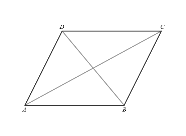 Let \(ABCD\) be a parallelogram with vertices \(A, B, C, D\) and the diagonals \(\overline{AC}\) and \(\overline{BD}\), as pictured above. Then \(ABCD\) is a rhombus if and only if the diagonals \(\overline{AC}\) and \(\overline{BD}\) perpendicular.