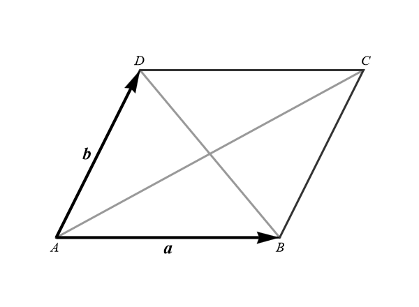 Proof (using vectors). Step 1. Introduce the following vectors by their representative line segments: \(\mathbf{a} = \overrightarrow{AB}\), \(\mathbf{b} = \overrightarrow{BC}\), \(\mathbf{c} = \overrightarrow{CD}\), and \(\mathbf{d} = \overrightarrow{DA}.\) Since \[ \mathbf{a} + \mathbf{b} + \mathbf{c} + \mathbf{d} = \mathbf{0}, \] we have that \[ \mathbf{b} + \mathbf{c} = - (\mathbf{a} + \mathbf{d}), \] (this vector is represented by the oriented line segment \(\overrightarrow{BD}\)) and \[ \mathbf{a} + \mathbf{b} = -(\mathbf{c} + \mathbf{d}). \] (this vector is represented by the oriented line segment \(\overrightarrow{AC}\)).