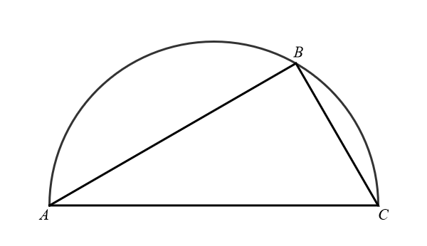 Since \(\overline{AC}\) is a diameter of a circle, this circle's center is the midpoint of \(\overline{AC}.\) Denote this midpoint by \(O.\) Introduce the following vectors by their representative oriented line segments: \[ \mathbf{a}=\overrightarrow{BA}, \quad \mathbf{b}=\overrightarrow{BC}, \quad \mathbf{c}=\overrightarrow{OC}, \quad \text{and} \quad \mathbf{d}=\overrightarrow{BO}. \] Since \(O\) is the midpoint of \(\overline{AC},\) we have that the vector \(-\mathbf{c}\) is represented by \(\overrightarrow{OA}.\) The following algebraic relationships hold among the vectors that we introduced: \begin{align*} \mathbf{a} & = \mathbf{d} - \mathbf{c} \\ \mathbf{b} & = \mathbf{d} + \mathbf{c}. \end{align*} Since \(O\) is the center of a circle and the points (A\), \(B\), and \(C\) are on that circle, we have \[ \| \mathbf{c} \| = \| \mathbf{d} \|. \] Our goal is to prove that the line segments \(\overline{BA}\) and \(\overline{BC}\) are orthogonal. To prove this, we calculate \begin{align*} \mathbf{a} \cdot \mathbf{b} & = (\mathbf{d} - \mathbf{c})\cdot (\mathbf{d} + \mathbf{c}) \\ & = \mathbf{d} \cdot \mathbf{d} - \mathbf{c} \cdot \mathbf{d} + \mathbf{d} \cdot \mathbf{c} - \mathbf{c} \cdot \mathbf{c} \\ & = \mathbf{d} \cdot \mathbf{d} - \mathbf{d} \cdot \mathbf{c} + \mathbf{d} \cdot \mathbf{c} - \mathbf{c} \cdot \mathbf{c} \\ & = \mathbf{d} \cdot \mathbf{d} - \mathbf{c} \cdot \mathbf{c} \\ & = \| \mathbf{d} \|^2 - \| \mathbf{c} \|^2 \\ & = 0. \end{align*} Consequently, the vectors \(\mathbf{a}\) and \(\mathbf{b}\) are orthogonal. Therefore, the line segments \(\overline{BA}\) and \(\overline{BC}\) are orthogonal. QED