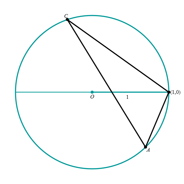 Positioning of a triangle inscribed in the unit circle. Every triangle inscribed in the unit circle can be rotated so that one vertex is at the point \((1,0),\) and one of the remaining vertices is above, and the other one below the horizontal diameter. If the triangle is obtuse or right, the vertex corresponding to the obtuse or right angle is rotated to the point \((1,0).\) If the triangle is acute, any vertex can be rotated to \((1,0).\) The four pictures below illustrate this claim.