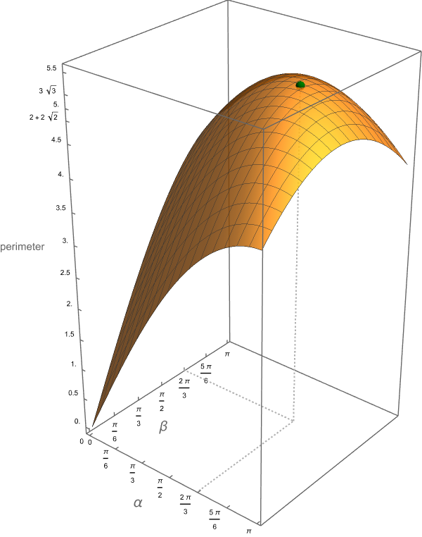 The right triangle with \(\alpha= \pi, \beta=\pi/2\) attracted my attention. The perimeter of this triangle is \(2+2\sqrt{2}.\) There are many other triangles with the same perimeter. On the graph of the perimeter function below, I emphasized the level curve \[ 2 \Bigl( \sin\bigl(\alpha/2\bigr) + \sin\bigl(\beta/2\bigr) + \sin\bigl((\alpha+\beta)/2\bigr) \Bigr) = 2+2\sqrt{2}. \] In the \(\alpha\beta\)-plane I emphasized all the pairs \((\alpha,\beta)\) which result in the triangles with the perimeter \(2+2\sqrt{2}.\) Three such pairs are given below \[ \bigl(\pi, \pi/2\bigr), \quad \bigl(\pi/2, \pi/2\bigr), \quad \bigl(\pi/2, \pi\bigr). \]