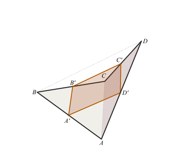 Conclusion. We proved that the line segments \(\overline{A'D'}\) and \(\overline{B'C'}\) are parallel and have equal length and that the line segments \(\overline{A'B'}\) and \(\overline{D'C'}\) are parallel and have equal length. Therefore, \(A'B'C'D'\) is a parallelogram. QED.