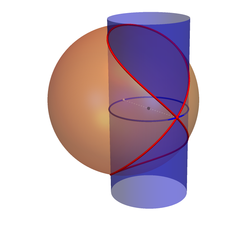 Before moving on to the new topic, I wanted to share with you the derivation of the parametric equations of the Viviani Curve, Problem 355 in Section 2.6. The Viviani Curve is the intersection of the sphere of radius \(2\) centered at the origin and the circular cylinder or radius \(1\) whose axis is the line \(x=1, y = 0, z = t\) where \(t \in \mathbb{R}.\)